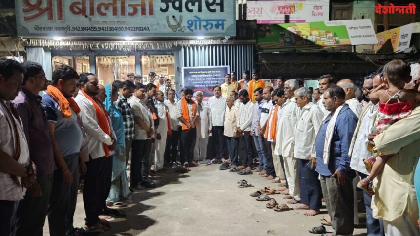 कळमनुरी (Hingoli) :- काश्मीर च्या पहलगाम येथे निष्पाप भारतीय पर्यटका ची गोळ्या घालून हत्या (Death) केली. घटनेत मृत्यू पडलेल्या भारतीयांना कळमनुरी शहरवासियांनी श्रद्धांजली देत या भ्याड हलल्याचा निषेध केला जम्मू काश्मीरच्या पहलगाम मध्ये भारतीय पर्यटकावर हल्ला करीत दहशतवाद्यांनी 28 निष्पाप भारतीयांना ठार केले. ही घटना अत्यंत घृणास्पद चीड आणणारी असून घटनेचा तीव्र निषेध कळमनुरी येथे नागरिकांनी केला.
