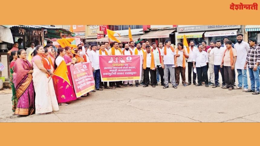 याविरोधात शिवसेना उध्दव बाळासाहेब ठाकरे पक्षाच्या वतीने २९ जुन रविवारी रोजी दुपारी शिवसेना जिल्हाप्रमुख प्रविण शिंदे, किशोर इंगळे, संजय निखाडे यांच्या नेतृत्वाखाली हिंदी भाषा सक्तीच्या जिआर पेटवून त्या शासन निर्णयाची होळी शहरातील दत्त चौकात शिवसैनिकांनी केली . व शासनाच्या विरोधात घोषणाबाजी केली या वेळी दत्त चौक परिसर घोषणांनी दणाणून गेला होता यावेळी तालुका प्रमुख गजानन पाटील, गोपल चव्हाण , तालुका प्रमुख नितीन माकोडे,महिला आघाडी जिल्हा प्रमुख कल्पना दरवई, खुशाल मिसाळ, अजय गाडगे, संतोष कुचनकर, शरद ठाकरे, सागर धवने, सचिन माकोडे, कुशल बोकडे, दिगांबर मस्के, विनोद पवार, विकास पवार, साजीद अब्दुल रहेमान, नंदा भिवगडे, प्रतिभा हरणखेडे, राधीका चव्हाण, राजु कोहरे, सचिन बारसकर, बबलू शहा, सुनील कटकुळे, राजु नागरगोजे, संतोष गदि, गणेश आग्रे, दिनकर भवरे, आसिफ अली काझी, गजानन खोडनकार, विनोद ढुमने व शिवसैनिक मोठ्या संख्येने उपस्थित होते